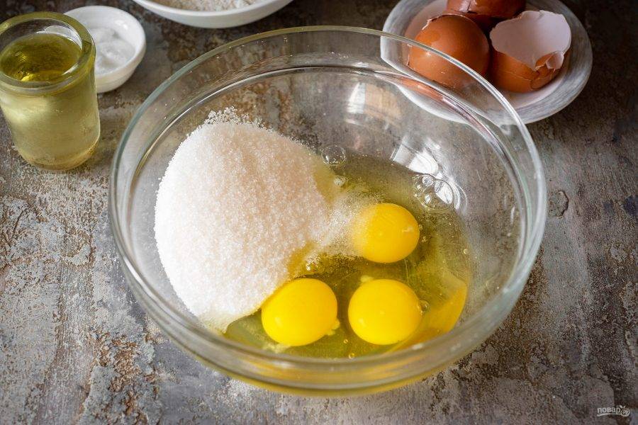 В миску вбейте яйца, добавьте растительное масло, ванилин, сахар, соль.