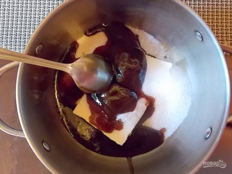 Соедините масло, сахар, мед и какао. Варите в течение 7 минут на среднем огне.