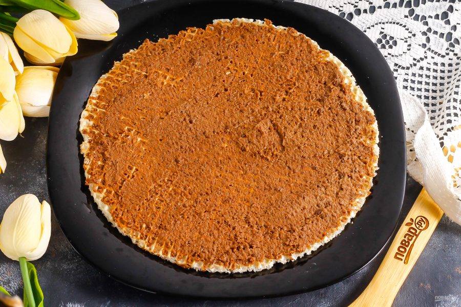 Таким образом соберите весь торт и поместите его в холодильник на 20-30 минут для пропитывания. Главное — размазывайте массу по коржам, иначе вам ее не хватит.