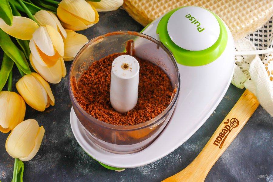 Шоколадное печенье разломите на кусочки и измельчите в крошку, используя подручную технику.