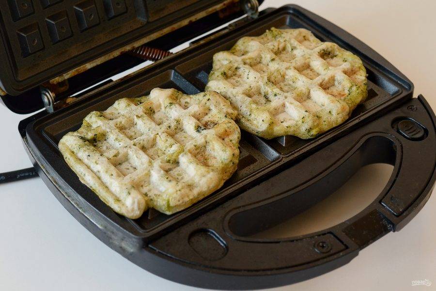 Выложите тесто порционно на разогретую и смазанную маслом вафельницу. Выпекайте вафли 8-10 минут.