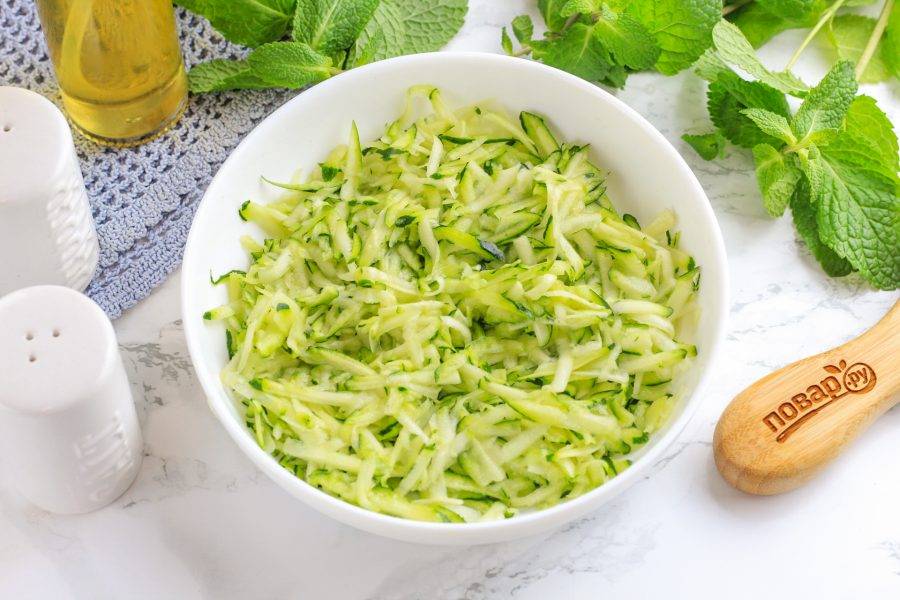 Срежьте хвостики с обеих сторон цукини и промойте плод в воде. Натрите на терке с крупными ячейками в глубокую емкость и посолите. Перемешайте и оставьте на 10 минут. После чего отожмите мякоть от выделенного сока, сок слейте.