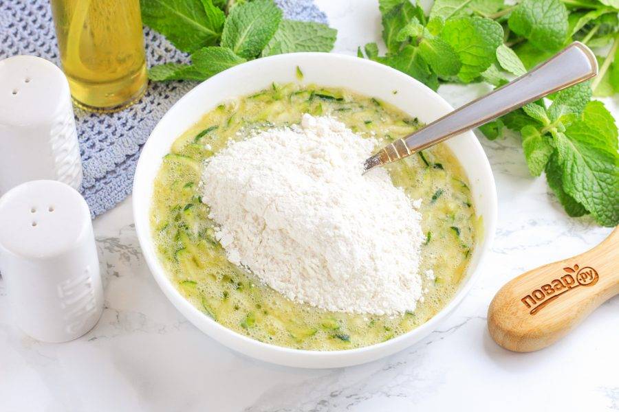 Всыпьте пшеничную муку и вмешайте ее в массу. Тесто должно получиться не очень плотным, как на оладьи.