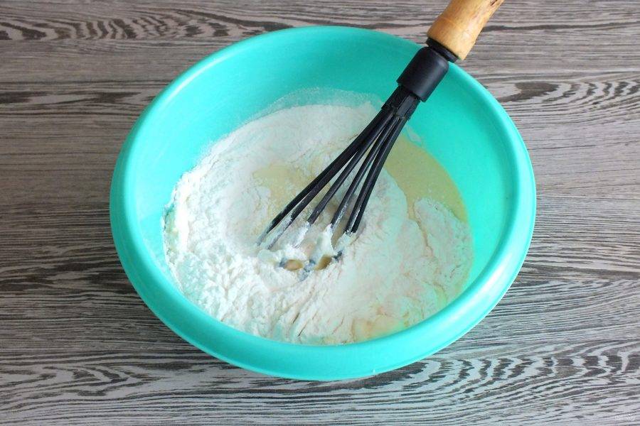 Добавьте муку, разрыхлитель для теста. Хорошо перемешайте.
