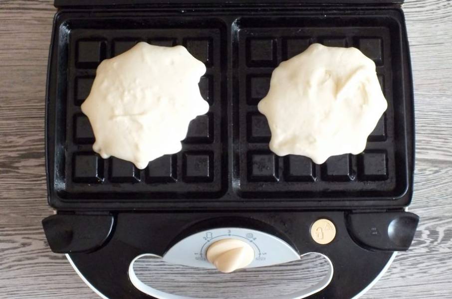 Разогрейте вафельницу. Панели смажьте растительным маслом. Налейте по 2 ст.л. ложки с горкой теста, закройте крышкой.