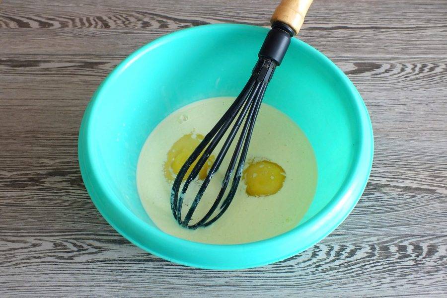 Добавьте яйца, сахар. Перемешайте до однородного состояния.