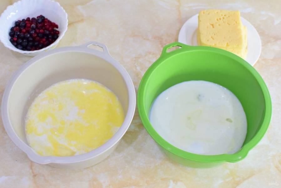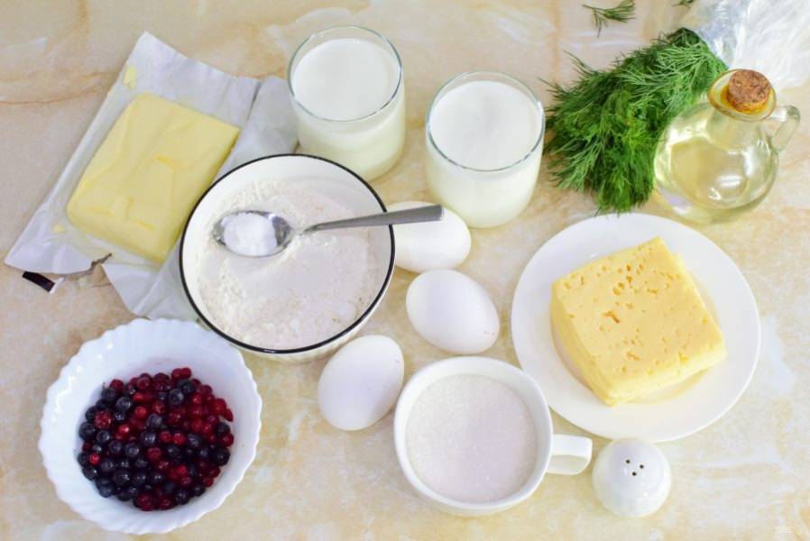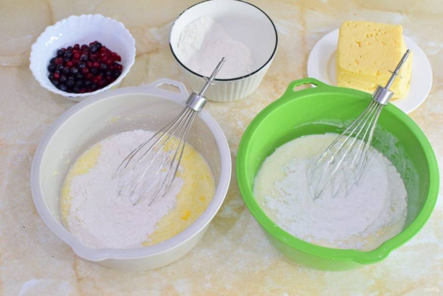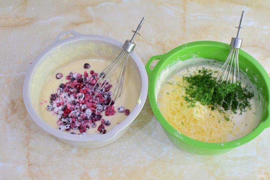 Ягоды немного обваляйте в крахмале и добавьте в сладкое тесто на молоке. А в тесто на кефире добавьте тертый сыр и измельченную зелень. Перемешайте оба вида теста.