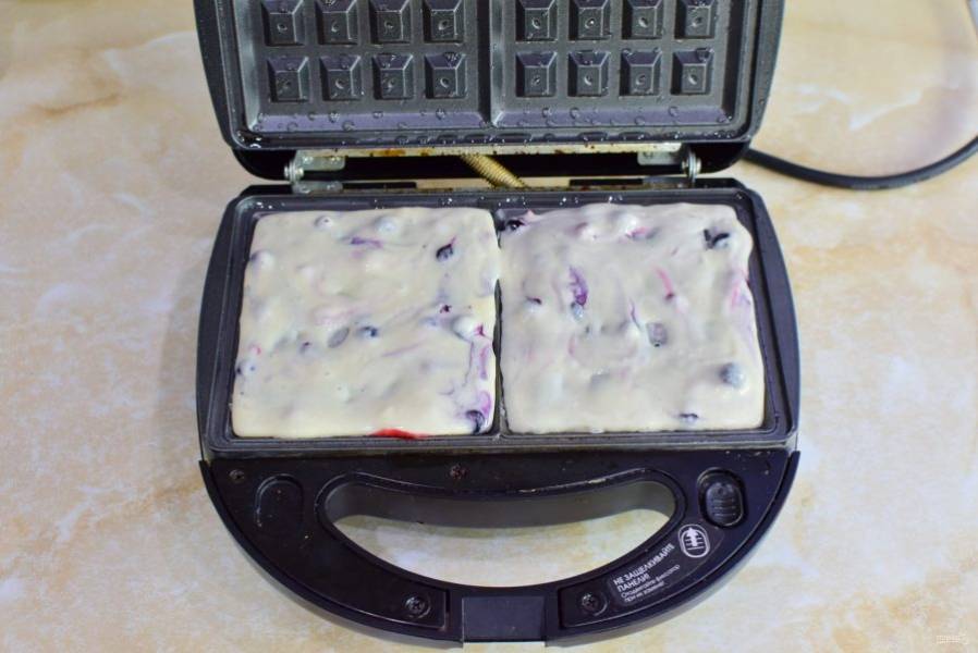 Затем напеките сырные вафли. Тесто распределяйте по всей вафельнице, чтобы в итоге получить целые вафли.