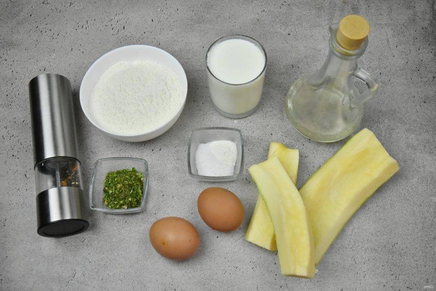 Подготовьте продукты для приготовления мягких вафель. Кабачок предварительно очистите от кожицы и семян. Используйте любой йогурт без добавок. Йогурт можно заменить кефиром или сметаной.
