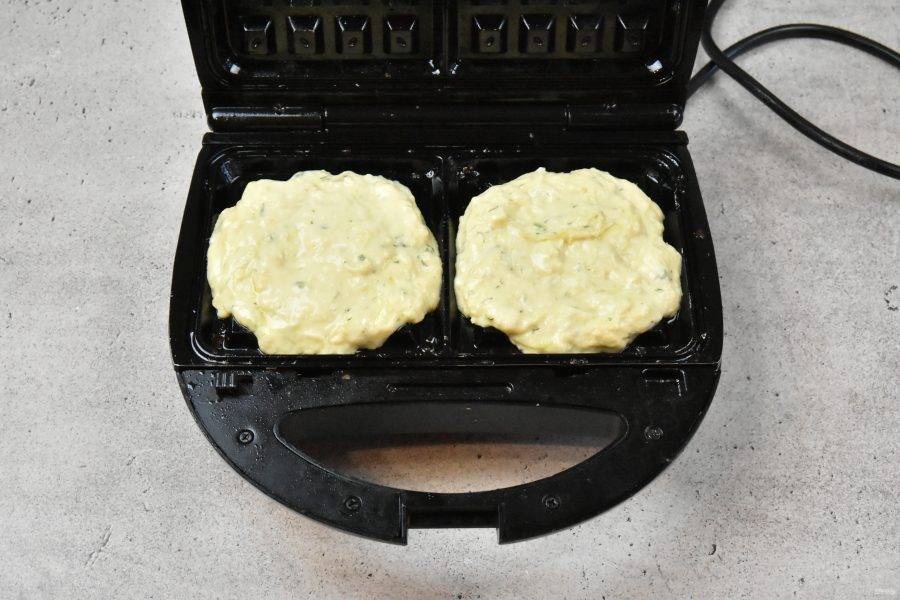 Установите в вафельницу панель для венских вафель. Подключите устройство к сети и дайте ему хорошо нагреться. Смажьте, по необходимости, нижнюю и верхнюю панели растительным маслом. Удобно делать это из дозатора с распылителем. Выложите на разогретую панель порцию теста и опустите верхнюю панель.