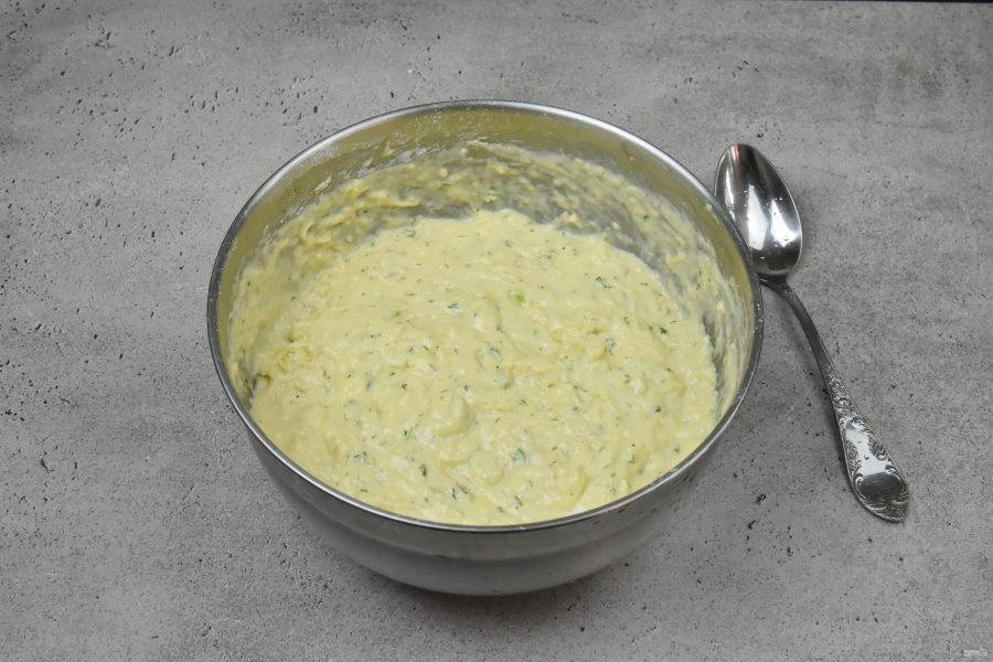 В жидкую составляющую теста переложите натертый и отжатый от лишней влаги кабачок, натертый сыр и хорошо вмешайте их в смесь для равномерного распределения. Добавьте сухой укроп, соль и черный молотый перец.