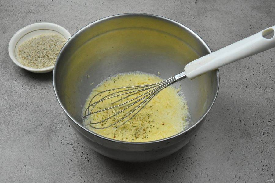 Сыр натрите на терке и добавьте к яйцам. Если вы планируете приготовить несладкий вариант вафель, можно добавить пряные травки или специи. В данном случае я добавила по щепотке тимьяна и орегано.