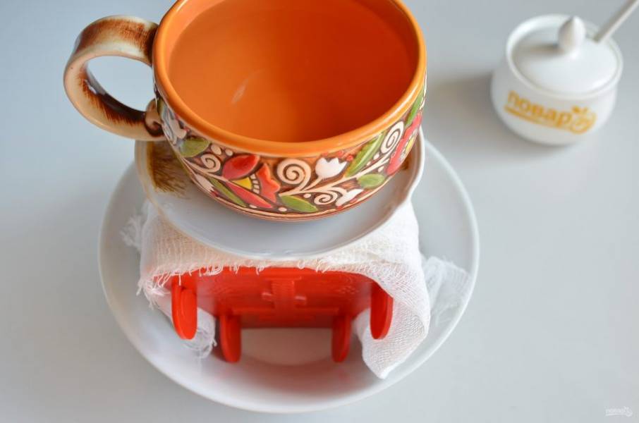7. Накройте формочку марлей, поставьте блюдце и гнет. Уберите в холодильник на 6-7 часов.