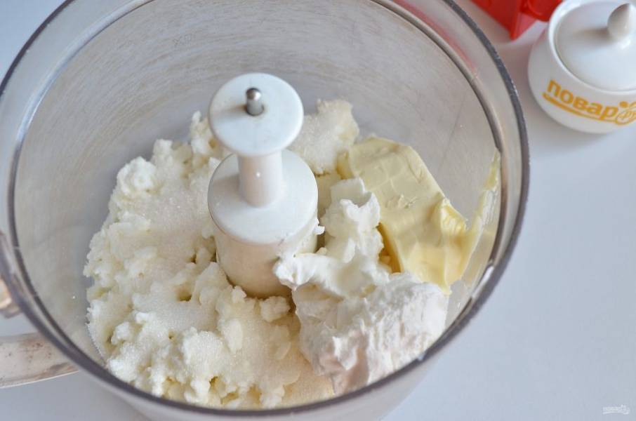 2. В чашу комбайна сложите творог, взбитые сливки, сливочное масло комнатной температуры, сахар и ванильный сахар. Включите машинку на несколько минут, чтобы масса стала однородной.