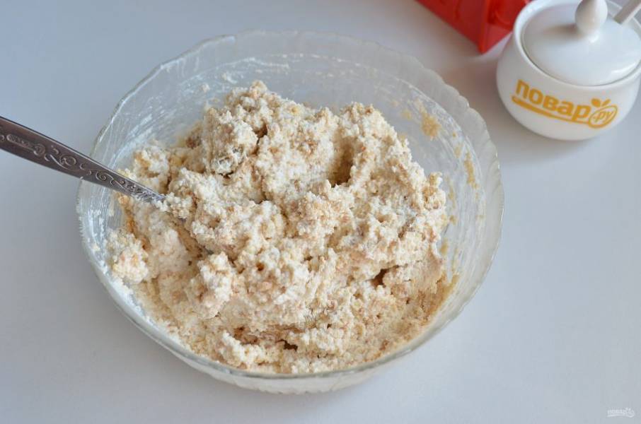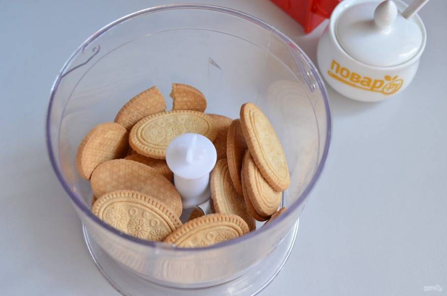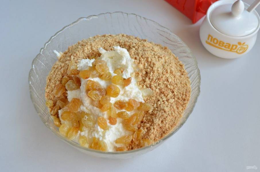 3. Измельчите в крошку печенье. Изюм залейте кипятком на пару минут, чтобы он распарился.
