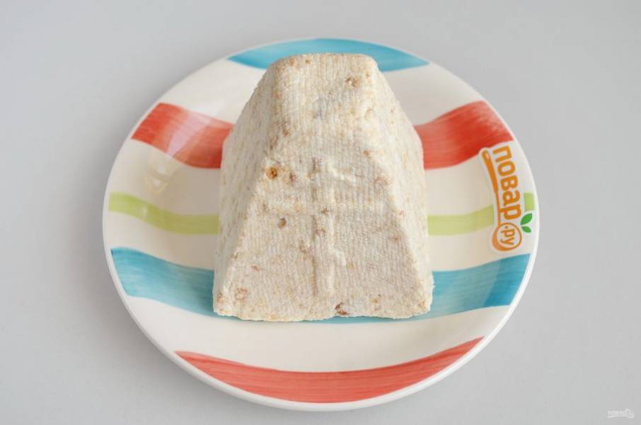 8. Осторожно переверните пасху на тарелку, снимите сначала формочку, потом марлю.