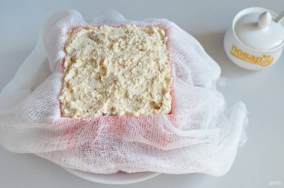 6. Формочку застелите марлей, переверните и поставьте в глубокую тарелку. Наполните творожной массой, слегка утрамбовывая.