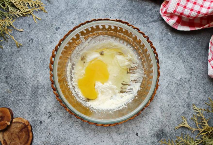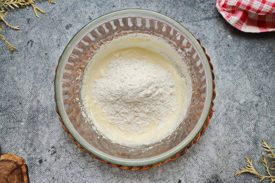 Муку соедините с разрыхлителем. Половину мучной массы просейте в масляную смесь. Хорошо перемешайте до однородного теста.