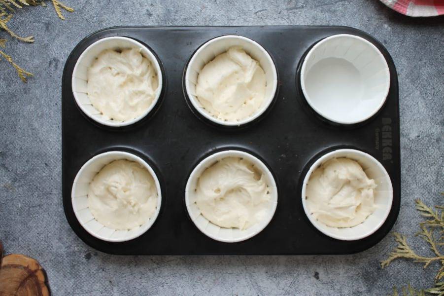 Разложите тесто по формочкам на 2/3 высоты, верх немного разровняйте. Поставьте капкейки в горячую духовку и выпекайте в течение 20-30 минут до готовности. Готовые капкейки достаньте из духовки и полностью остудите.