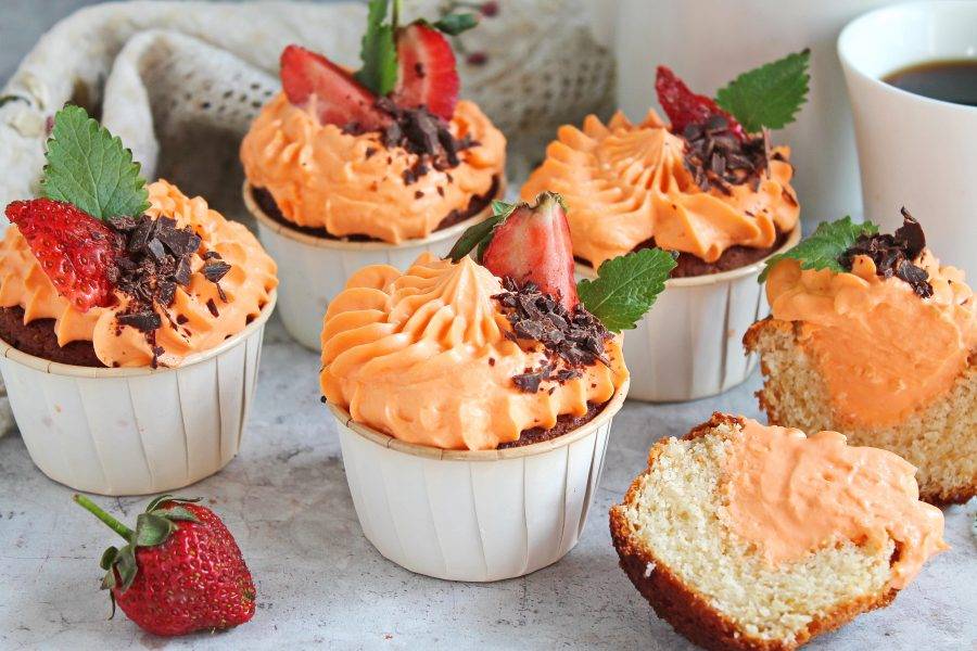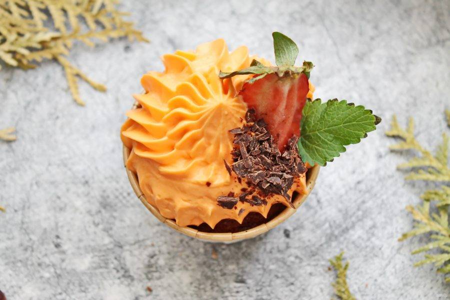 Крем переложите в кондитерский мешок с насадной и заполните углубление. Затем сделайте шапочку, украсьте готовые капкейки и подавайте к столу.