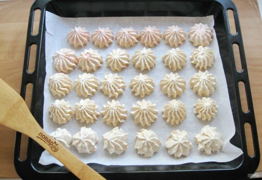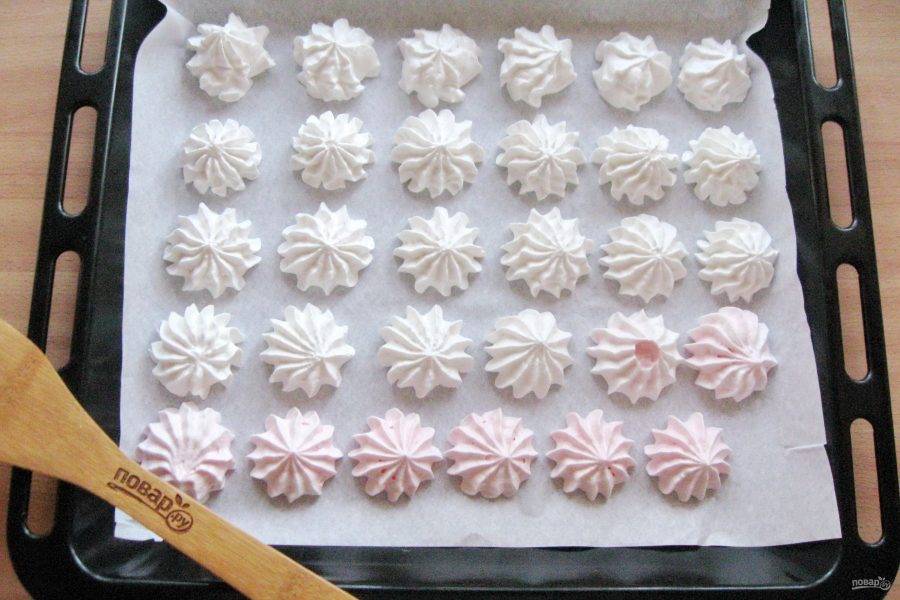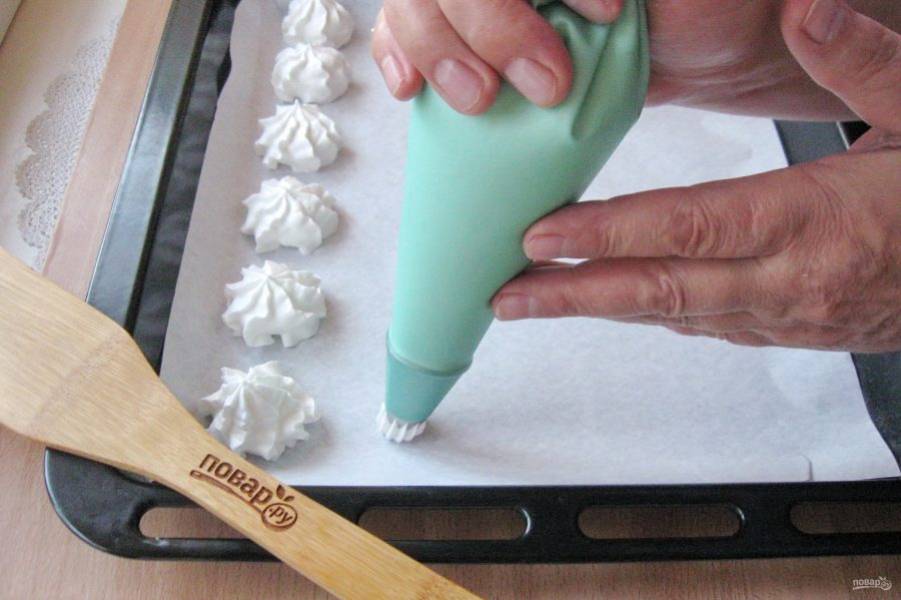 С помощью кулинарного мешка с насадкой отсадите меренгу на противень с пекарской бумагой.