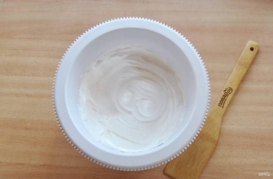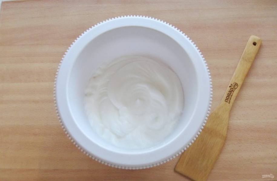 Постепенно добавляйте сахар, не переставая взбивать. Получится густая, плотная, блестящая масса.