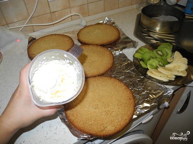 Готовый бисквит разрежьте вдоль на несколько коржей. Сделайте крем. Для этого взбейте сливки и сахар при помощи миксера. Выложите крем между коржами. Порежьте бананы и киви и выложите их на крем. Оставьте торт охлаждаться на час-два.