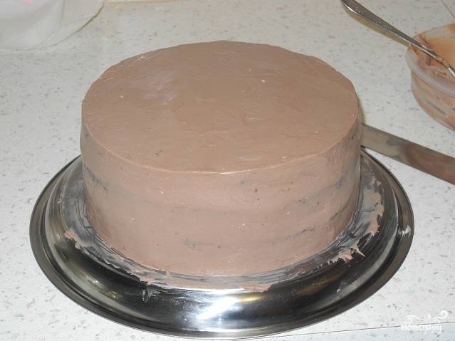 Приготовьте шоколадный крем. Для этого смешайте топленый шоколад и сливочное масло, взбейте массу миксером. Аккуратно покройте кремом готовый тортик, аккуратно и тщательно промажьте бока.