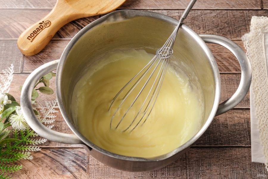 Поставьте кастрюльку на средний огонь и постоянно помешивая, доведите смесь до закипания.
