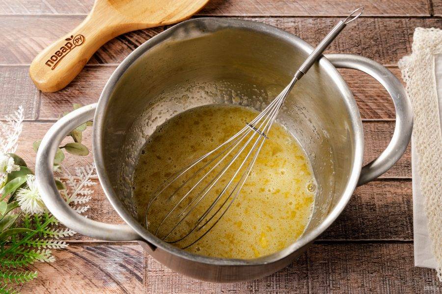 Так как крем у нас заварной и его нужно будет охладить, начнём с него. В небольшой кастрюльке взбейте яйцо с сахаром и ванилином.