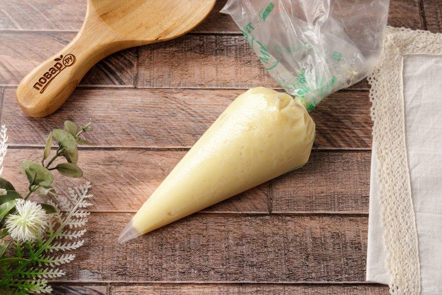 Достаньте крем из морозилки и переложите его в кондитерский мешок или в обычный пакет. Плотно скрутите в кулёчек и срежьте кончик.