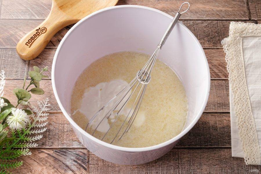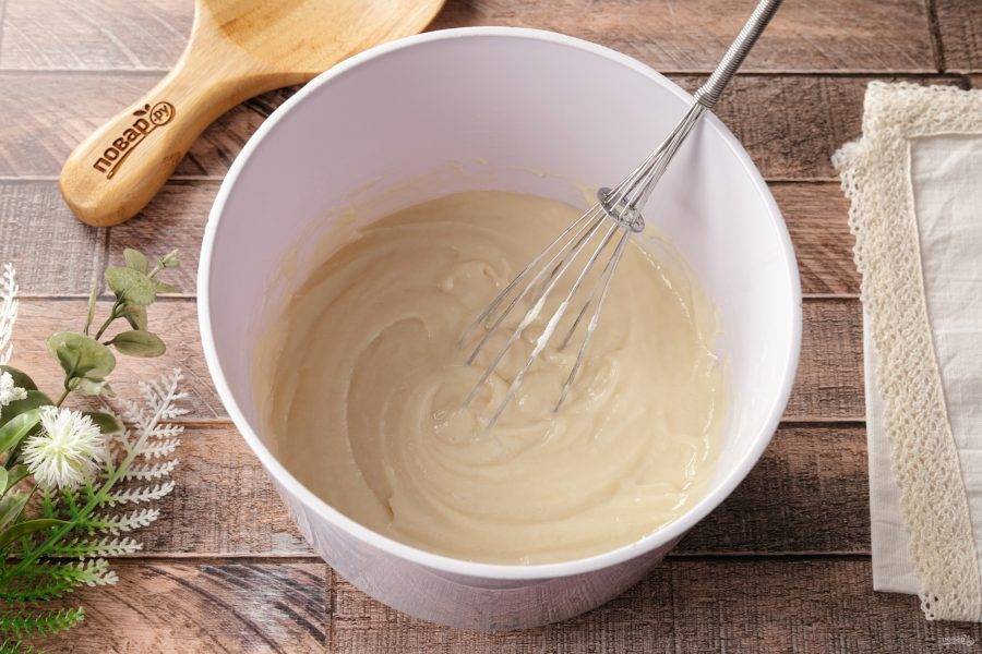 Снова перемешайте, добавьте муку и разрыхлитель.