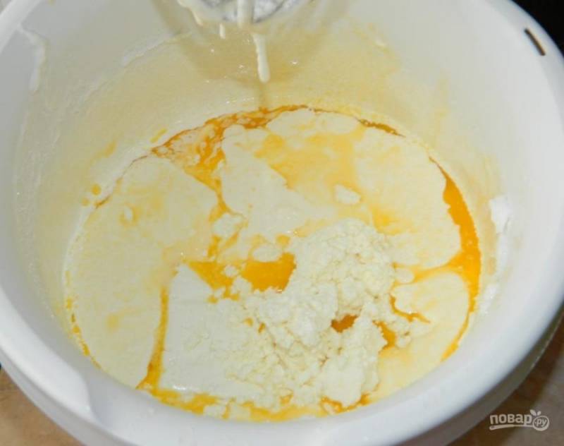 Творог протрите через сито. Добавьте к нему сахар, соду, растопленное масло, сметану и желтки.
