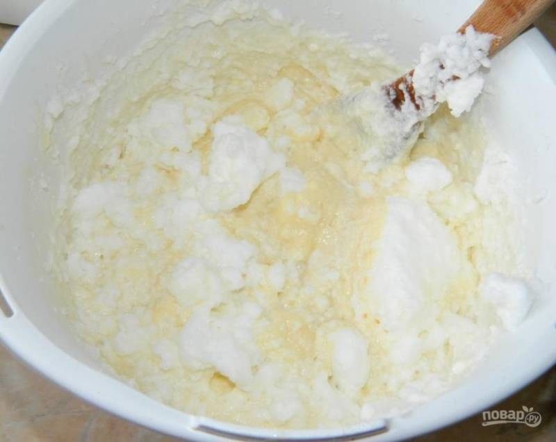 Вмешайте муку, ванилин и взбитые белки. Все аккуратно перемешайте.