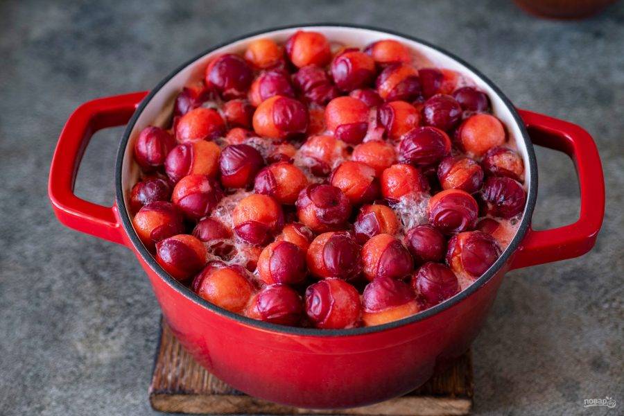 Затем наберите в кастрюльку воду и поставьте ее на огонь. Как только жидкость закипит, выложите в кастрюлю алычу и оставьте ее на 5 минут в кипящей воде.