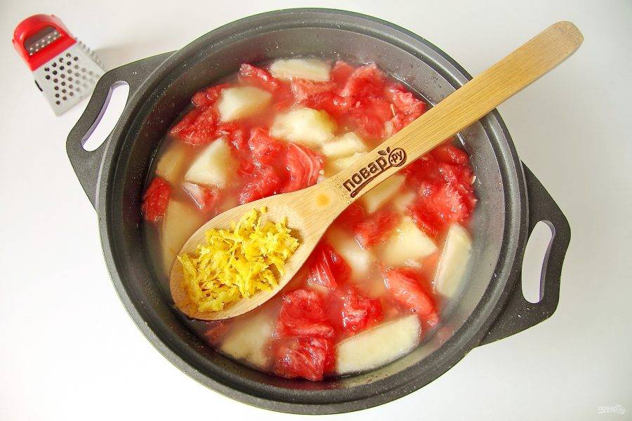 Выжмите из лимона сок. Цедру натрите на мелкой или средней терке. Добавьте цедру и сок в кастрюлю.
