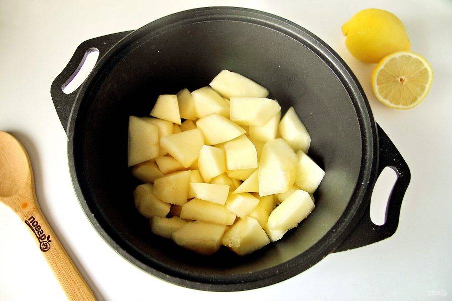 Дыню очистите от кожуры и семечек, нарежьте мякоть кубиками и переложите в большую кастрюлю (у меня казанок).