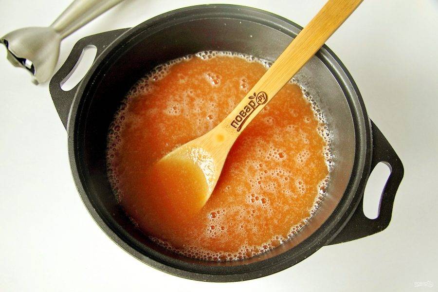С помощью погружного блендера превратите варенье в однородную массу, доведите до кипения и снимите с огня.