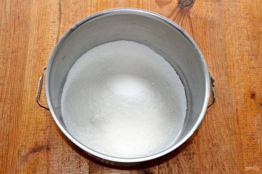 Для приготовления сиропа всыпьте в кастрюлю сахар, влейте воду и поставьте на огонь.