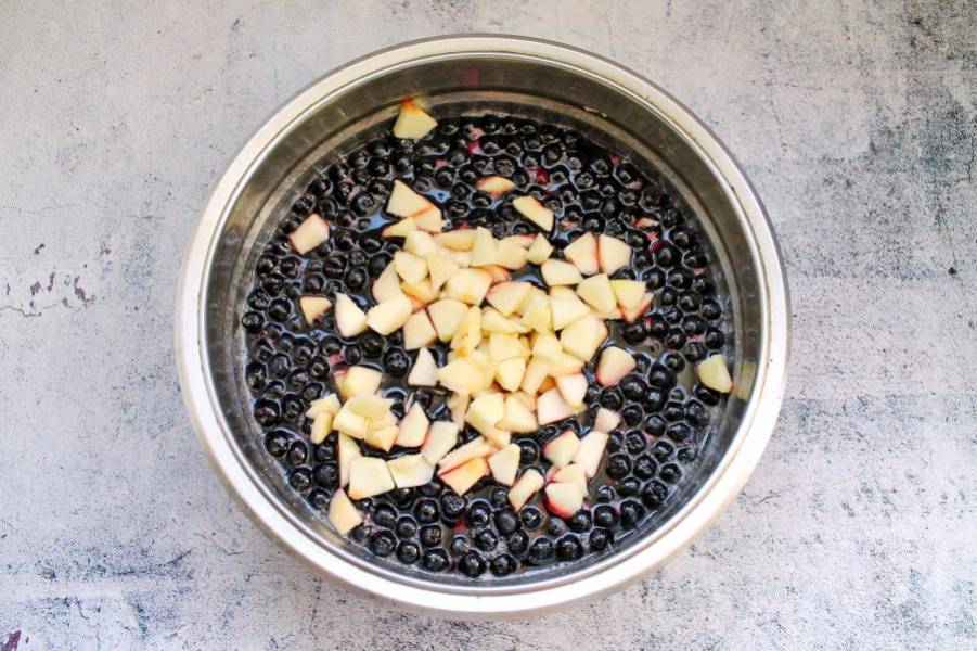 Яблоки порежьте на дольки, удалив сердцевину, и выложите к ягодам.