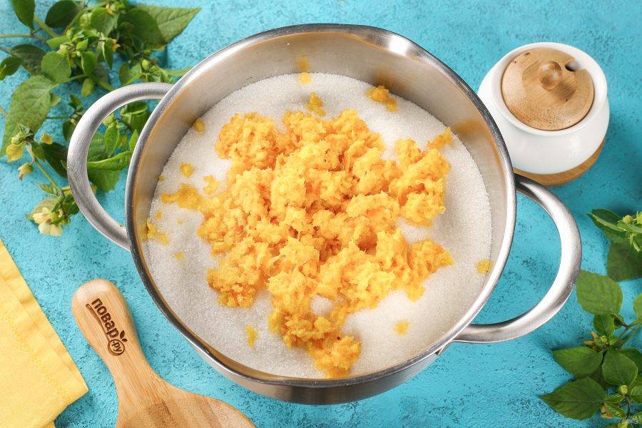 Добавьте сахар. Апельсин тщательно промойте и обдайте кипятком, чтобы убрать горечь. Затем разрежьте на части, удалив косточки и измельчите при помощи блендера или мясорубки. Добавьте к остальным ингредиентам.