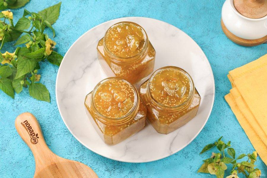 Варенье из физалиса с апельсином готово. Разлейте его в сухие стерильные баночки и закрутите крышками. После чего укутайте и оставьте до остывания.