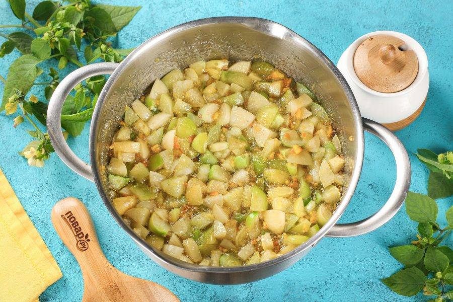 Всё перемешайте и на небольшом огне, помешивая, дайте сахару раствориться. Затем доведите до кипения и варите 10-15 минут.