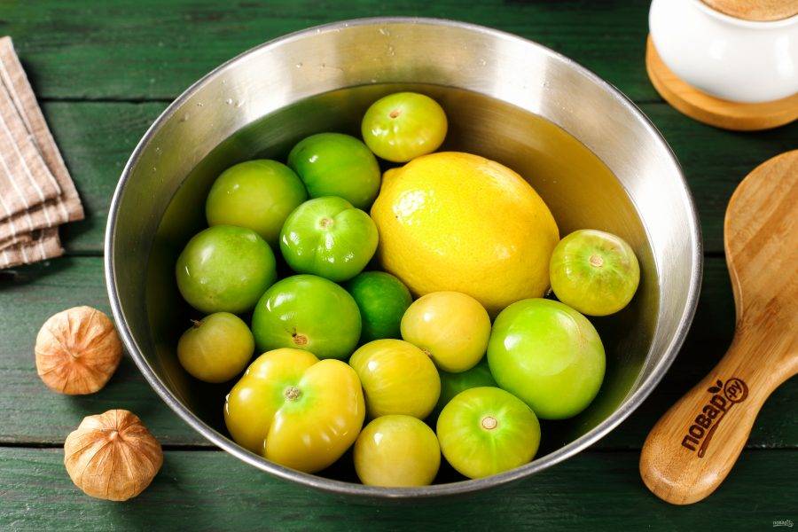 Физалис очистите от оболочки и тщательно промойте в тёплой воде. Тщательно промойте лимон. Затем выложите физалис и лимон в миску, залейте кипятком, после чего сразу же его слейте и следом налейте холодную воду.