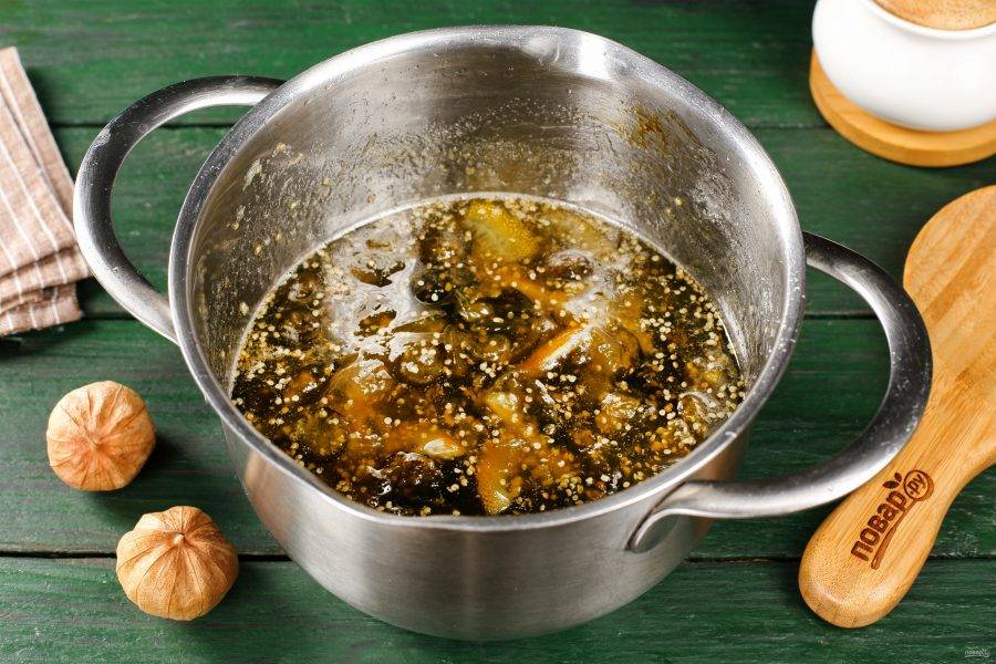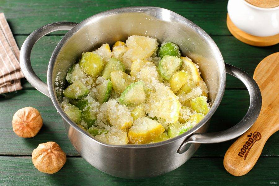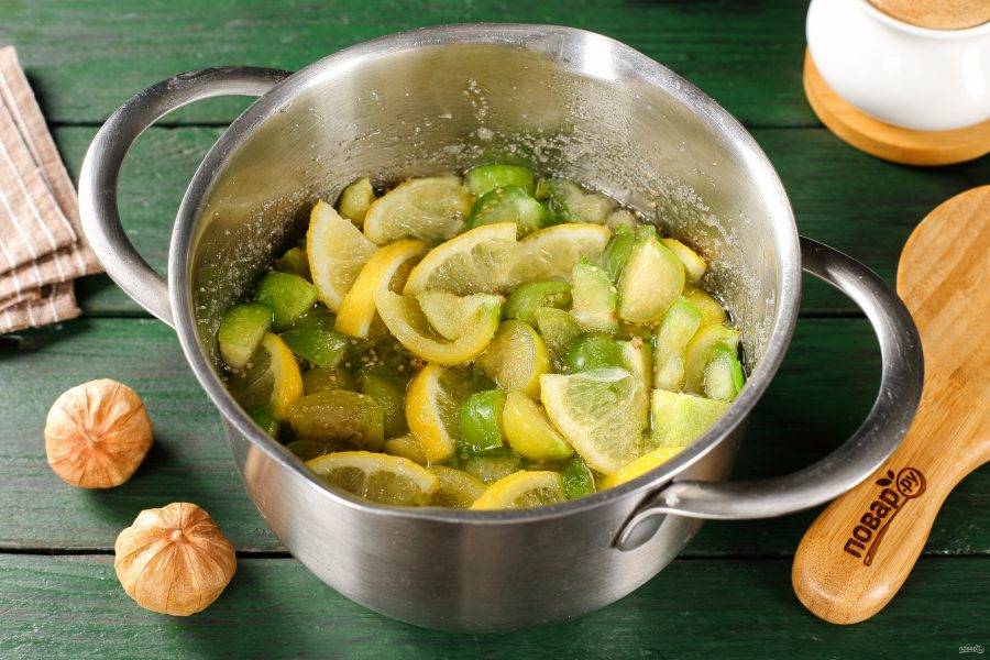 Лимон нарежьте тонкими кружочками, а затем каждый кружочек ещё на четыре части. Добавьте лимон к физалису, удалив все косточки.