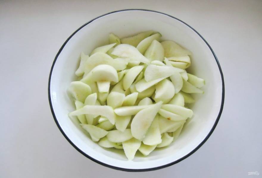 Удалите у груш сердцевину и нарежьте дольками, но не очень тонкими. Чистый вес у меня составил 1 кг 300 грамм.