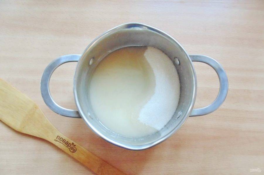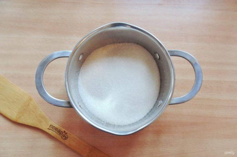 Приготовьте сироп. В кастрюлю насыпьте сахар.
