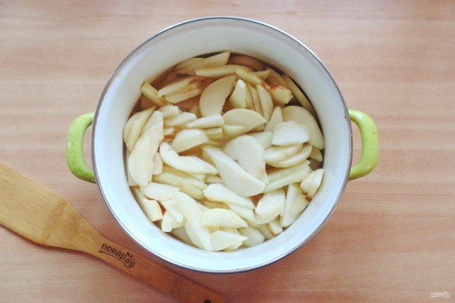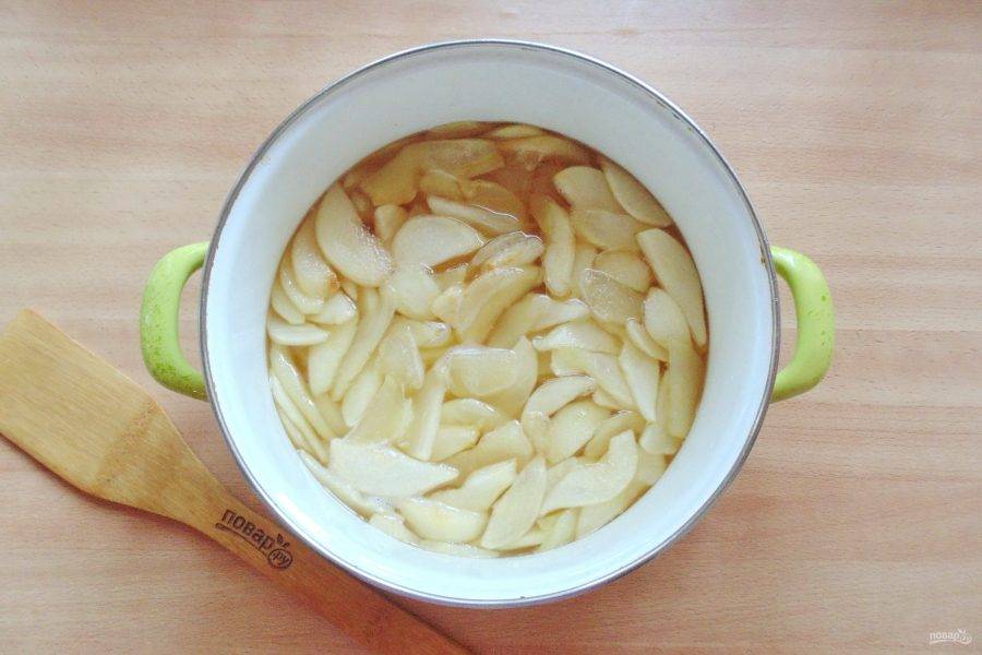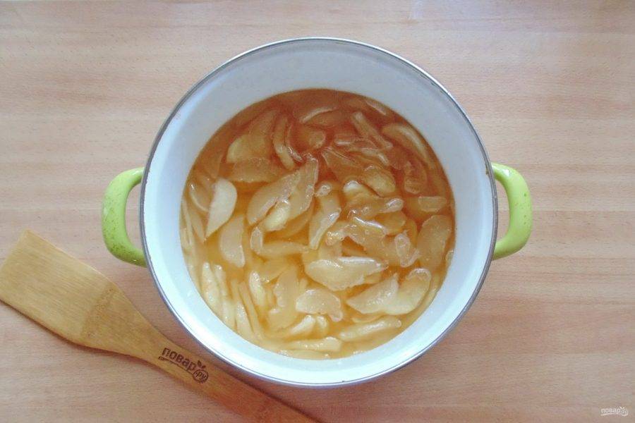 Груши переложите в таз или в кастрюлю с толстым дном. Залейте горячим сиропом и оставьте на час.