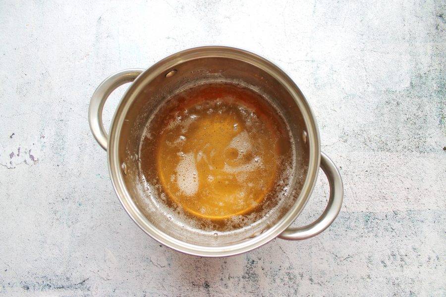 В кастрюлю с толстым дном влейте воду и добавьте сахар. Поставьте все на средний огонь и доведите до кипения, варите в течение 2 минут.