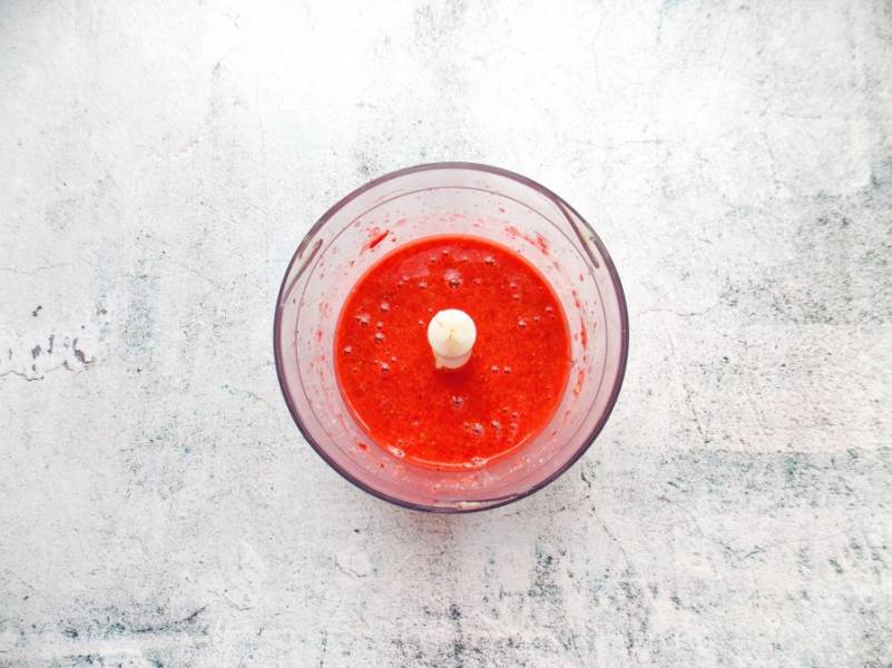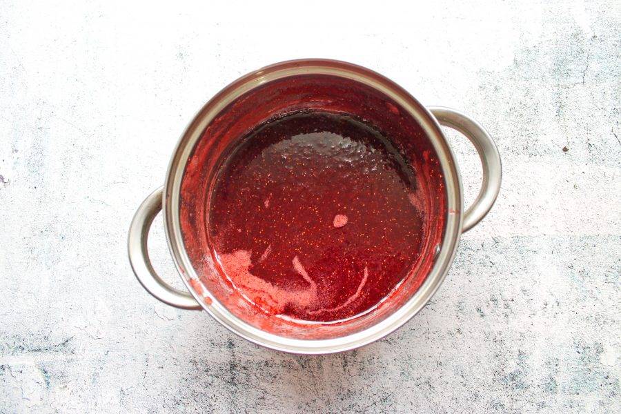 Перелейте клубничную массу в кастрюлю с толстым дном и добавьте сахар. Варите варенье на медленном огне, после закипания, в течение 20-30 минут. Время зависит от сочности ягод и желаемой густоты. Готовое варенье разложите по стерилизованным, сухим банкам и дайте полностью остыть. После этого закройте банки крышками и уберите на хранение.